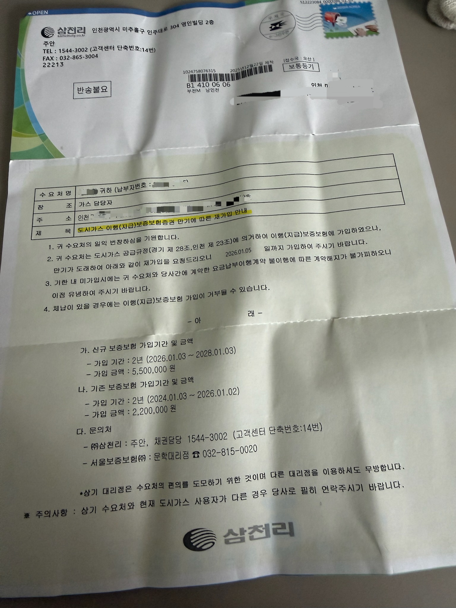 오늘 갑자기 직원분이 전화가 왔다. 집배원이 삼천리에서 우편물을 주고 갔다고.가스비는 자동이체로 내고 있는데 내가 받을게 뭐가 있지 싶어서 얼른 사진으로 받았다.도시가스이행 보증보험?220만원? 근데 550만원으로 올랐어? 220만원 낸 적 없는걸? 550만원은 당장 어디서 구하는데!초면인 사실이라 삼천리에 전화했는데, 어느정도 기준이 넘는(계량기 16등급 이상이라나...) 영업용 건물은 법에 의해서 필수로 가입하게 되어있단다. 순간, 550만원이 어디있어! 라는 생각이 들었는데 보증보험에는 요율에 따른 수수료를 내면 되는거라고 한다. 그래도 억울하다. 난 한번도 밀린적이 없는데 그렇다고 돌려받는 것도 아닌게 필수로 정해져 있다는 사실. 도시가스 시스템 유지를 위해 최소한의 비용을 이렇게 정해둔 거겠지만..
